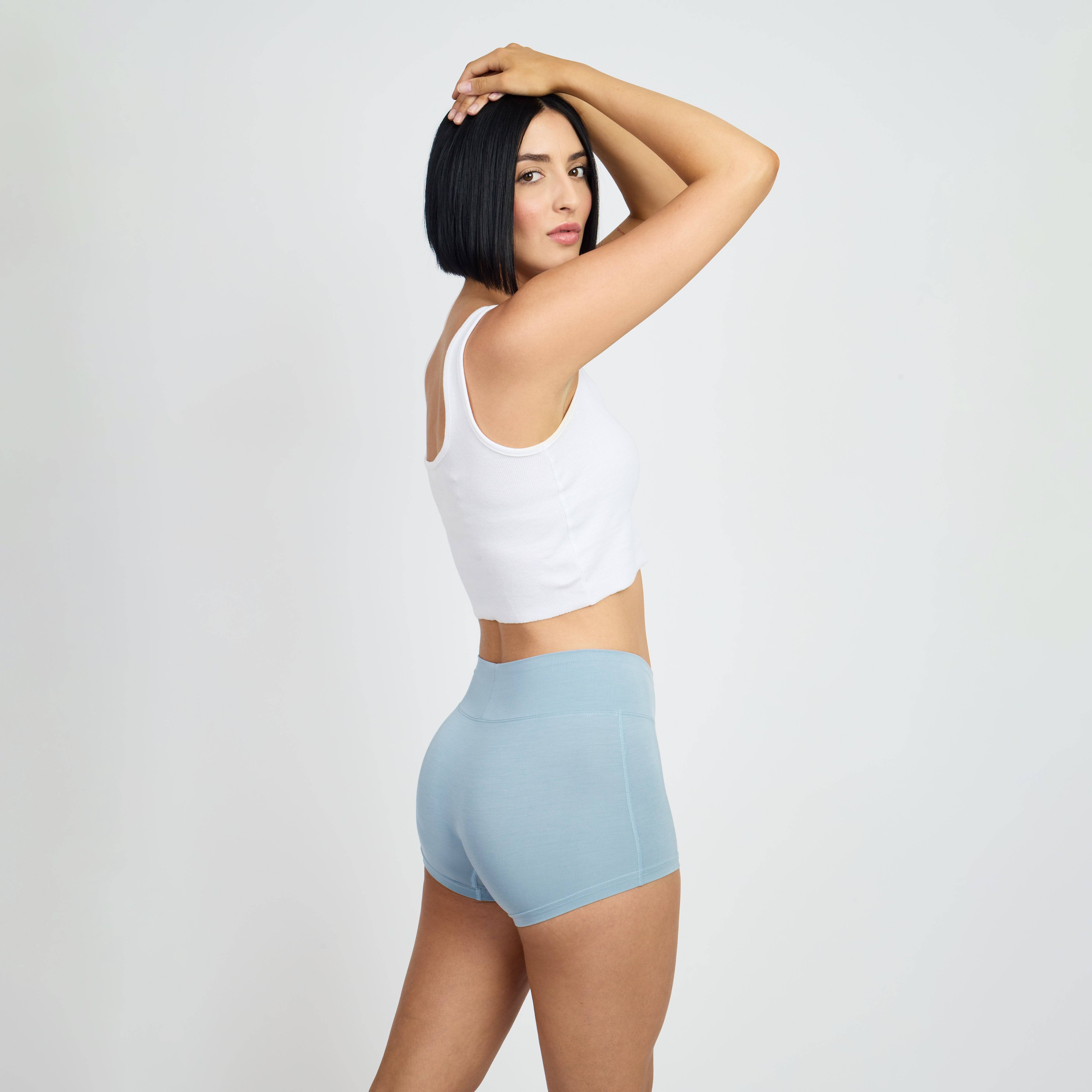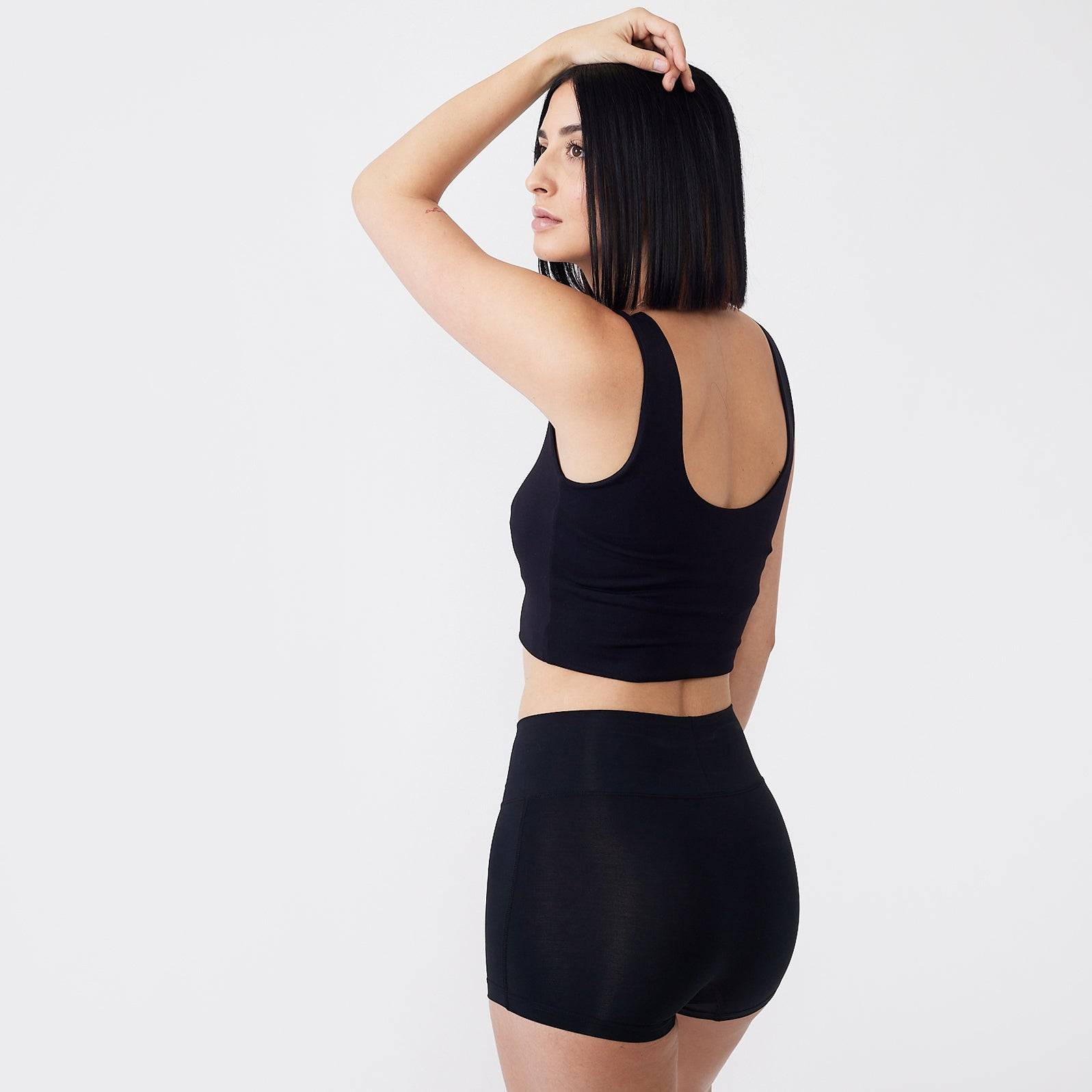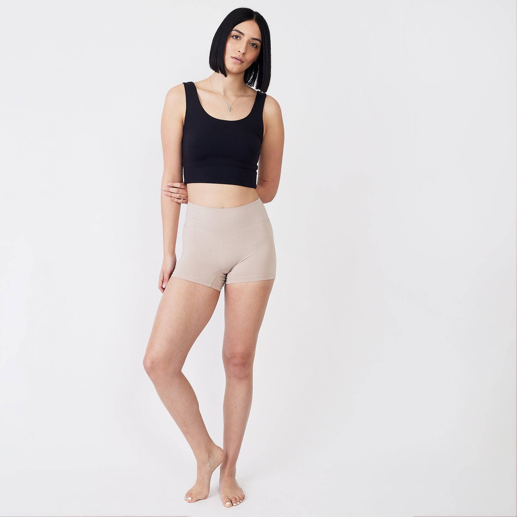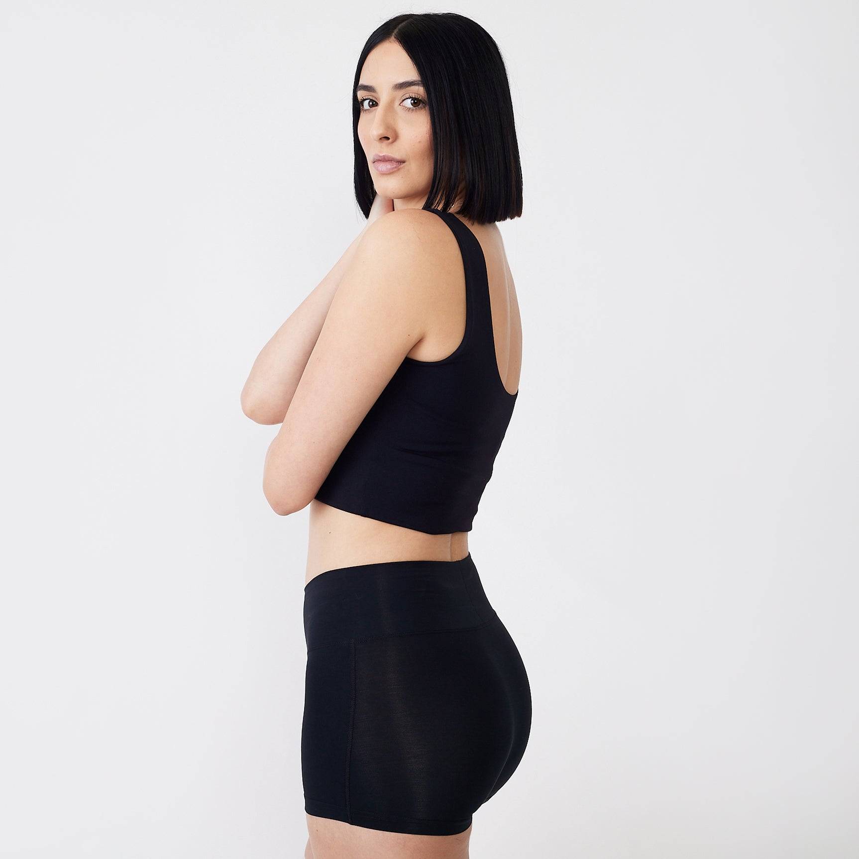 Made from ultra-breathable bamboo with 2" inch boyshort coverage. The True High Rise offers a secure, smoothing fit — and the gusset is thoughtfully designed to hold a winged pad when needed.